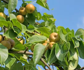 Die aus China stammende Nashi-Birne wächst ähnlich der europäischen Birne und wurde in China und Japan seit langem kultiviert. Der frostharte Baum trägt runde apfel-ähnliche Früchte mit saftigem Fruchtfleisch ähnlich der europäischen Birne. Die ungleichmässig reifenden Früchte sollten nur reif gepflückt werden, da sie nicht nachreifen. Die wärmeliebende Nashi-Birne bevorzugt eher feuchten, kalkarmen, durchlässigen Boden. Damit der Ertrag reich ausfällt, sollte der wuchsfreudige Baum regelmässig zurückgeschnitten werden. Die wärmeliebende Nashi-Birne wird als Edelsorte auf eine spezielle Unterlage aufgesetzt. Nashi-Birnensorten sind häufig nicht selbstbefruchtend, das heisst, sie benötigen einen zweiten Baum, um Früchte zu tragen. Als Befruchter können andere Nashi- oder Birnensorten wie ‚Williams Christ‘ oder ‚Conference‘ dienen.
